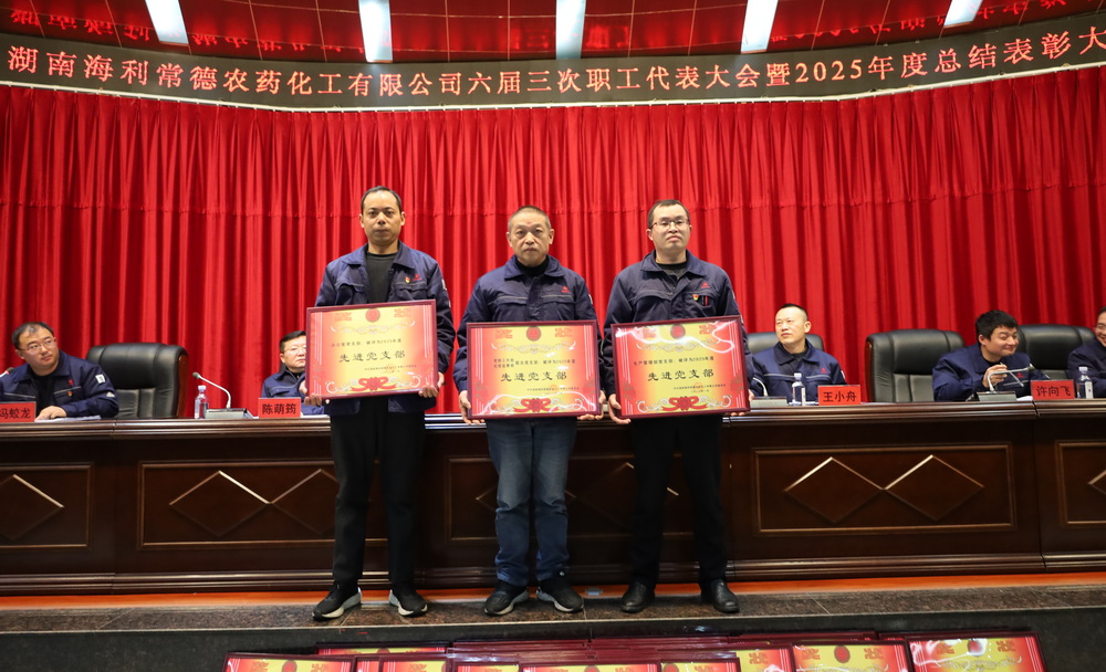会议指出,过去的一年常德公司坚持以习近平新时代中国特色社会主义思想为指导,深入贯彻党的二十大和二十届历次全会精神,践行“平安、绿色、精益、创新”理念,在氨基甲酸酯类系列产品市场不佳的前提下,狠抓高附加值产品的生产,甲嘧产量连创新高,公司连续14年来一般以上安全事故零发生,产品一次检验合格率、出厂产品合格率双双达到100%,得到了先正达、科迪华等国外大客户的高度认可。公司荣获省工信厅“2025年湖南省绿色工厂”称号,公司党委荣获省国资委系统“2025年先进基层党组织”称号,刘凌波同志获评常德国家级开发区“卓越贡献企业家”称号,虞孝云同志获评湖南省国资系统“国企工匠”称号。