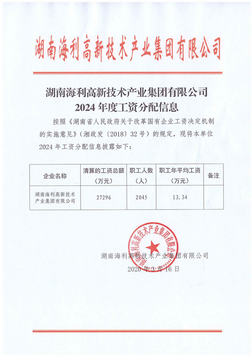 湖南海利高新技术产业集团有限公司2024年度工资分配信息